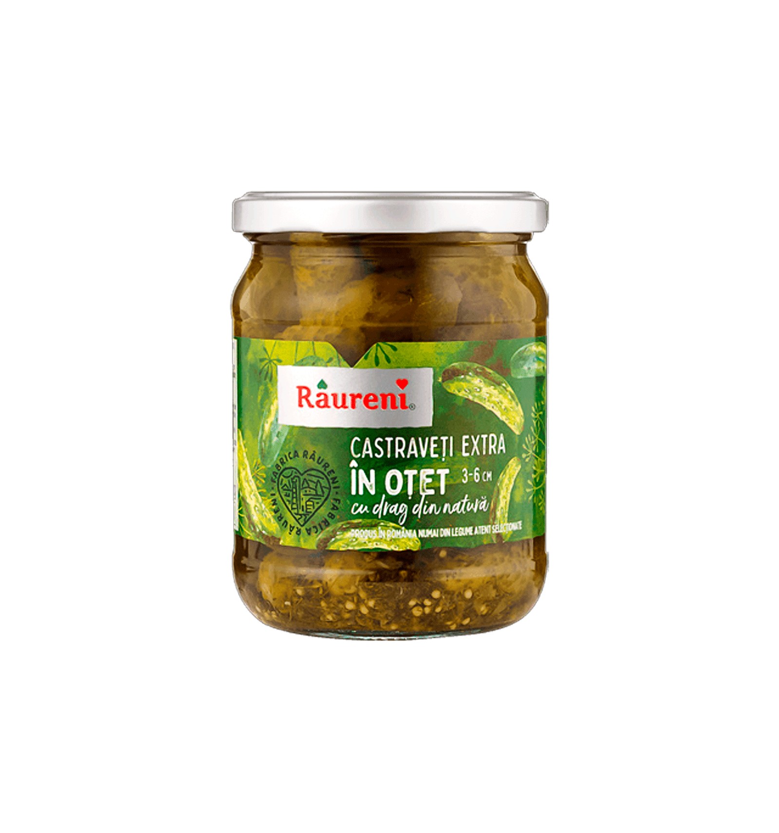 Ingredientes: pepinos enteros, agua, ácido acético, sal, azúcar, agente de endurecimiento: cloruro de calcio, especias: eneldo, granos de mostaza.