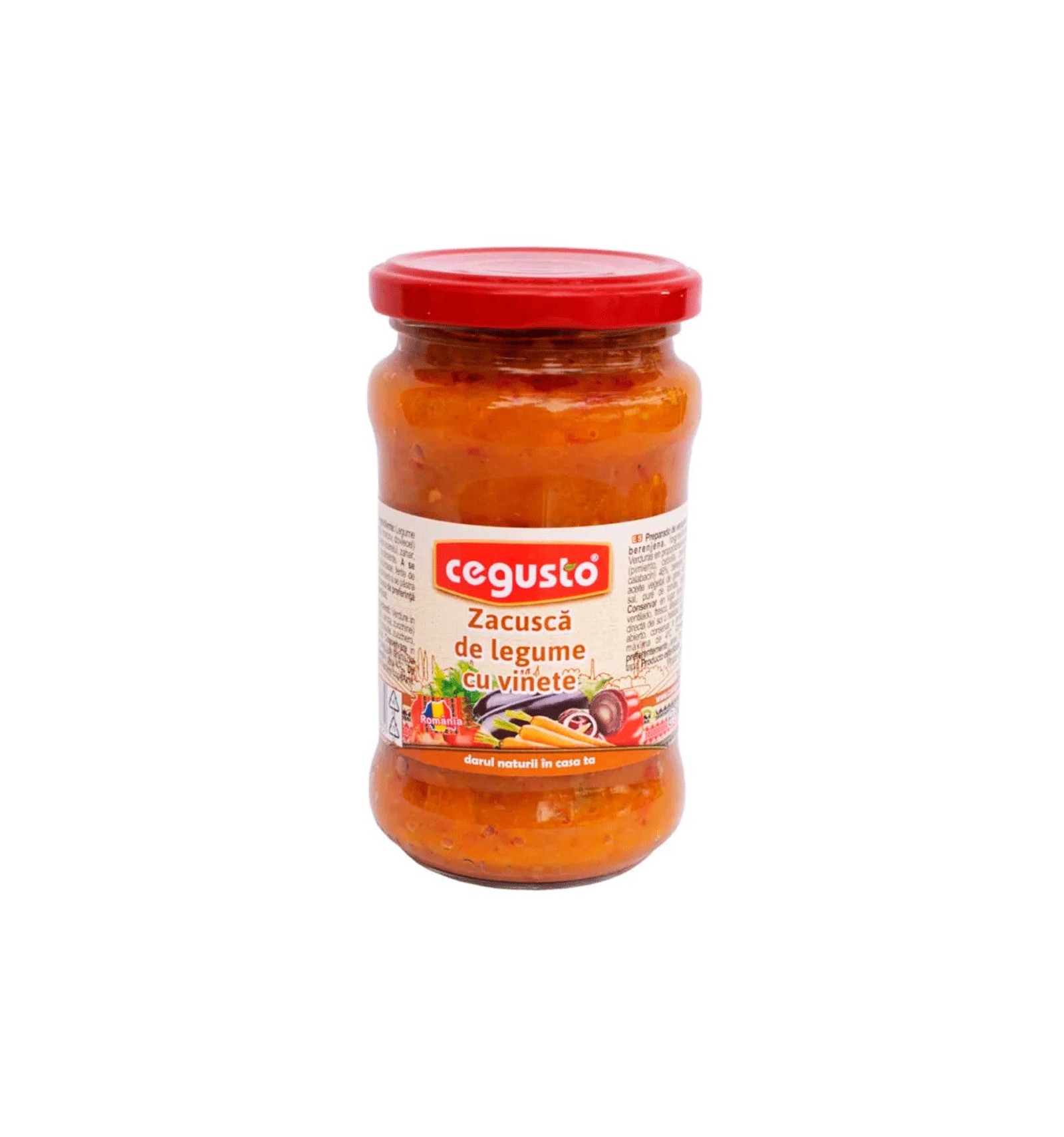 Ingredientes: verduras en proporciones variables (pimiento, cebolla, zanahoria, calabacín) 60%, berenjenas 45%, aceite vegetal de girasol, azúcar, sal no yodada, pasta de tomate, especias.