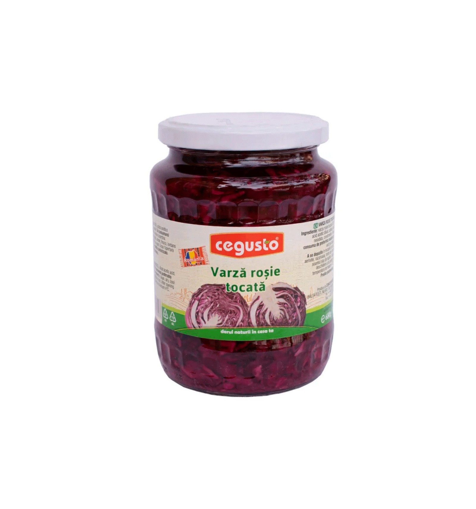 Ingredientes: col roja picada 52%, ácido acético diluido, azúcar, sal no yodada, especias.