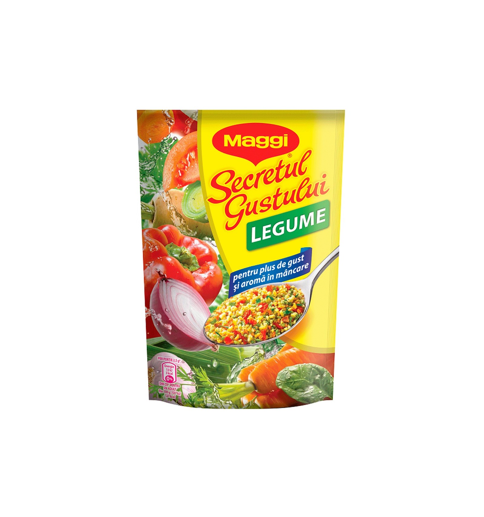 Ingredientes: sal yodada, potenciadores de sabor (glutamato monosódico, 5-ribonucleótido disódico), azúcar, verduras deshidratadas (7.2%) en proporciones variables (zanahorias, polvo de puerro, polvo de ajo, cebolla y polvo de cebolla, hojas de perejil, polvo de espinacas, tomates, chirivía, polvo de apio, pimiento rojo), almidón de maíz, aceite vegetal de girasol, extracto de ajo (concentrado de ajo 0.3%, maltodextrina), especias (pimienta negra, cúrcuma), aromas, colorantes (extracto de pimiento rojo, riboflavina).