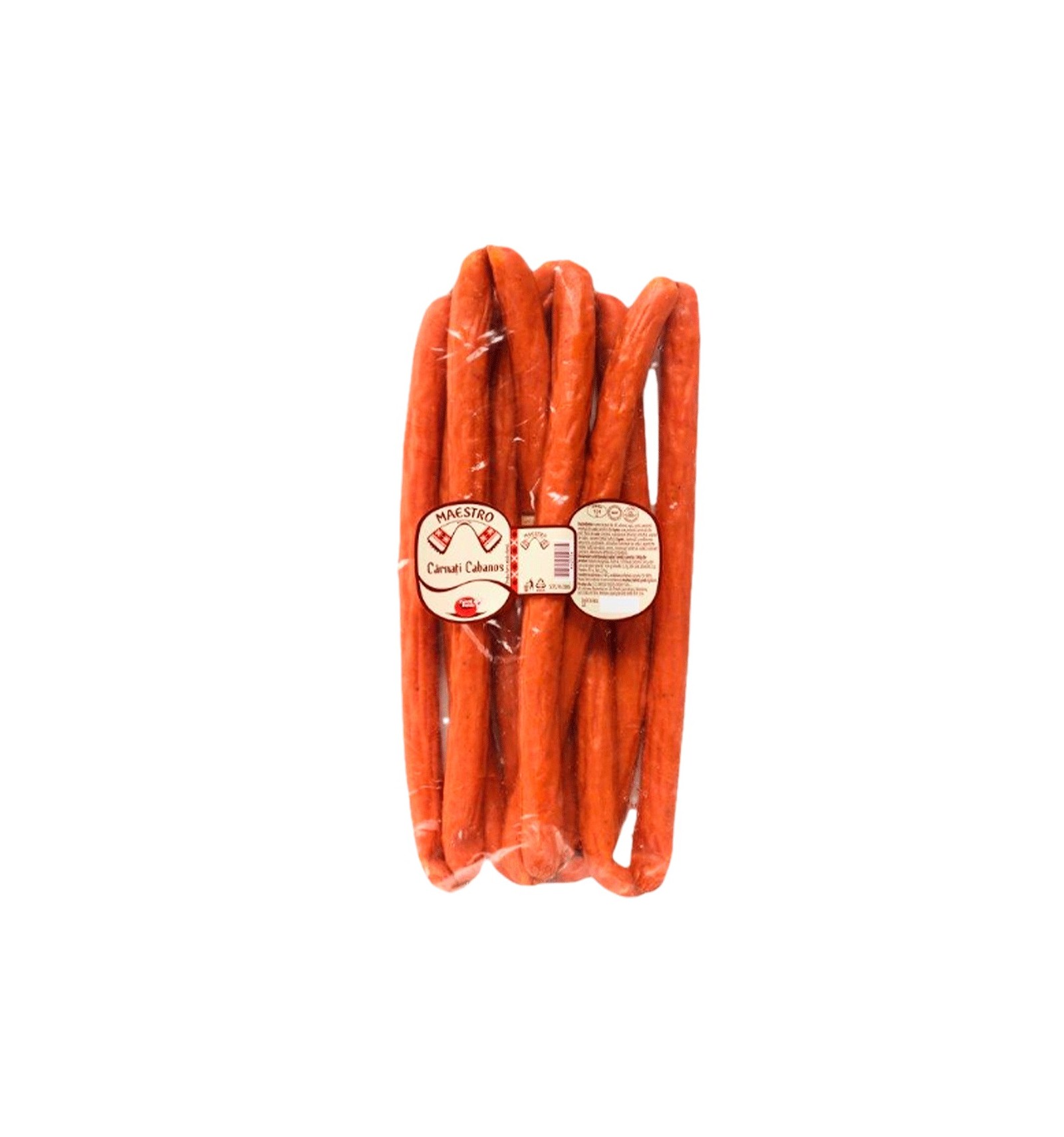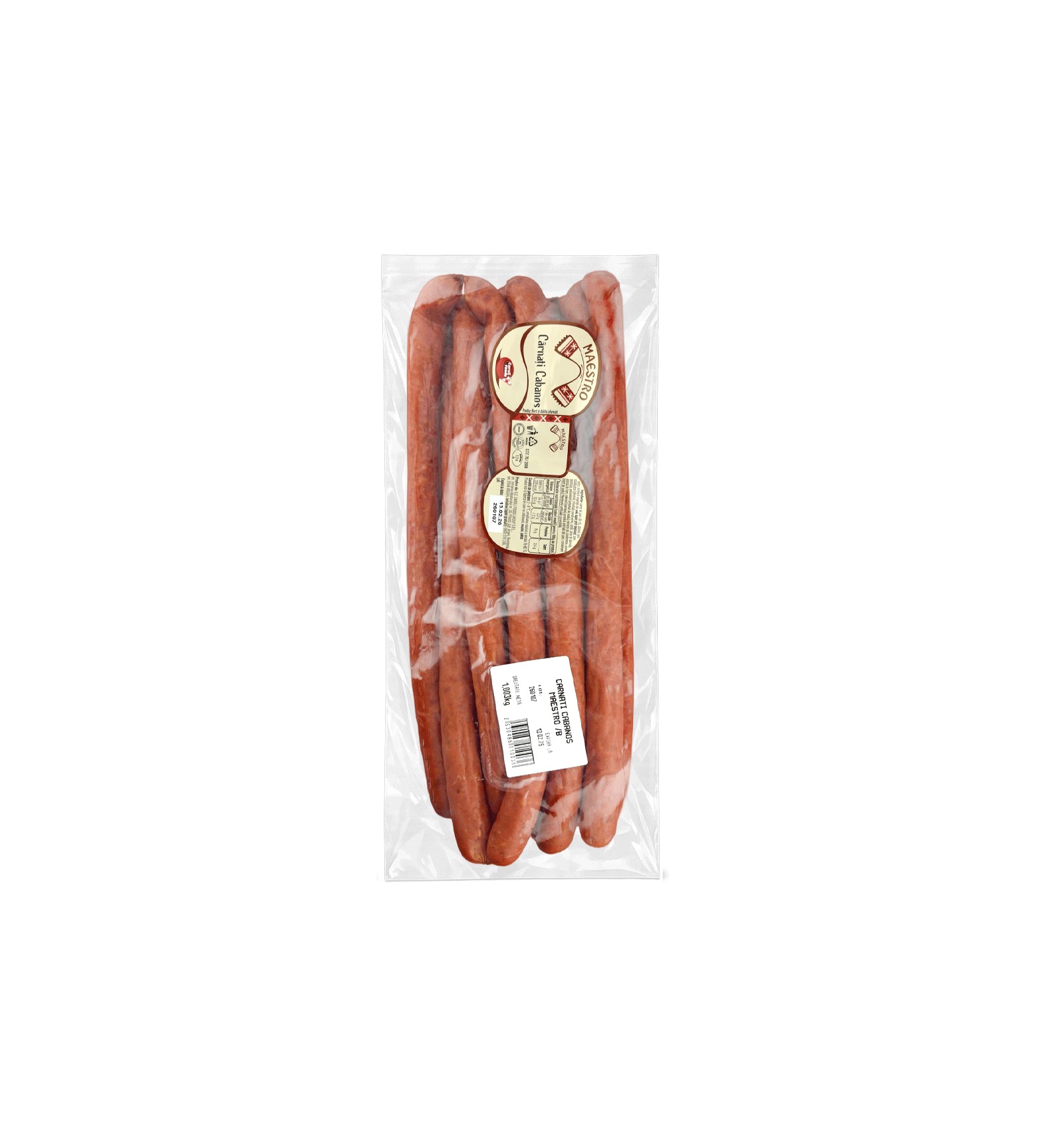 Ingredientes: carne de cerdo de la UE, tocino, agua, corteza, proteína vegetal de soja, proteína de leche, sal, proteína animal de cerdo, harina de soja y lecitina, estabilizadores (difosfatos, trifosfatos, alginato de sodio), azúcares (azúcar, lactosa (leche), dextrosa), especias, extractos de especias, antioxidante (eritorbato de sodio), agentes de endurecimiento (sulfato de calcio), aromas, conservante (nitrito de sodio), colorante (carmín). Membrana artificial comestible.