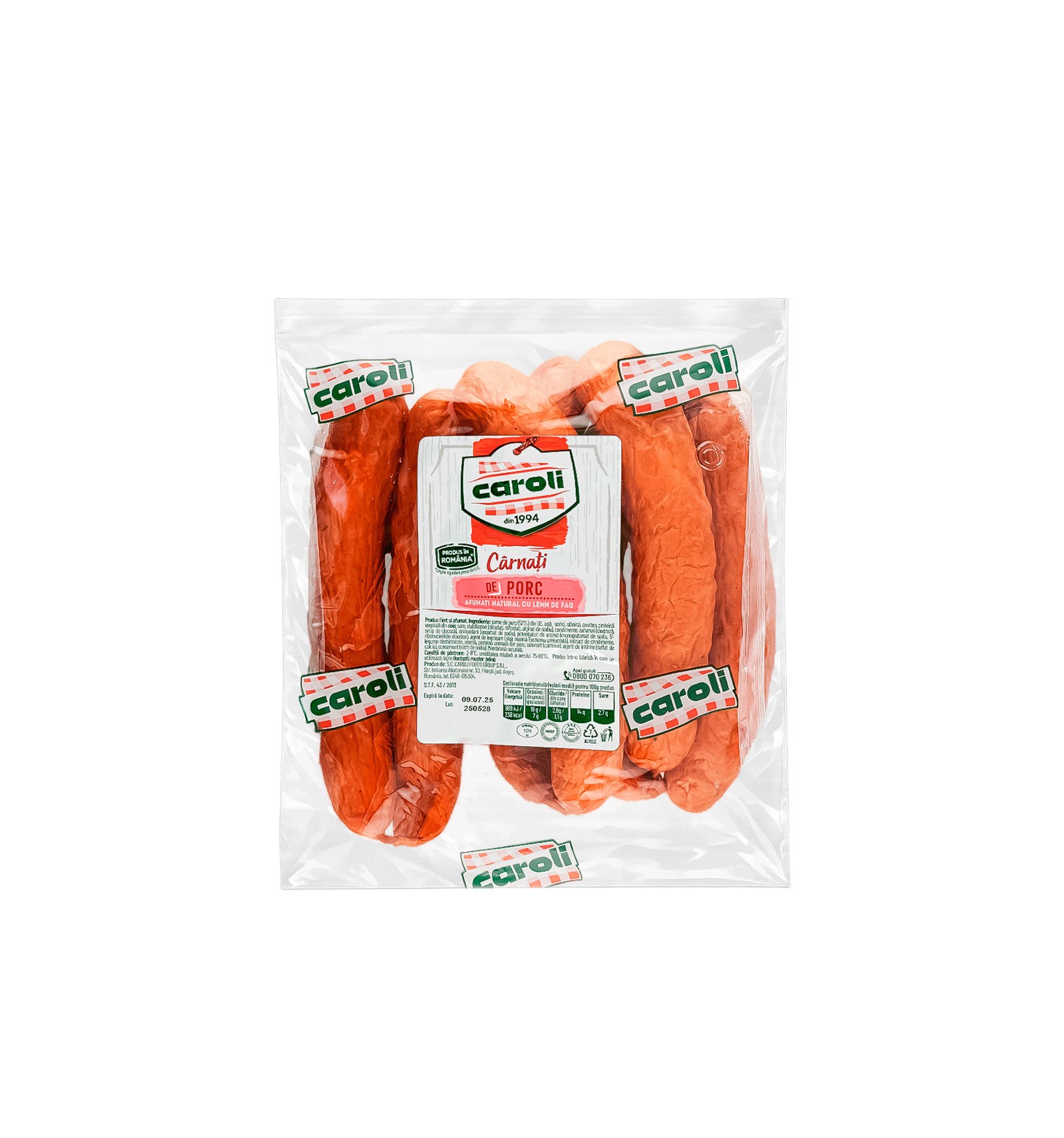Ingredientes: carne de cerdo (52%) de la UE, agua, cuero de cerdo, tocino, almidón, proteína vegetal de soja, sal, estabilizadores (difosfatos, trifosfatos, alginato de sodio), especias, azúcares (dextrosa, jarabe de glucosa), antioxidante (ascorbato de sodio), potenciadores del sabor (glutamato monosódico, 5'-ribonucleótidos disódicos), agente espesante (alga marina Eucheuma transformada), extracto de especias, verduras deshidratadas, aroma, proteína animal de cerdo, colorante (carmín), agente de endurecimiento (sulfato de calcio), conservante (nitrito de sodio). Membrana natural.