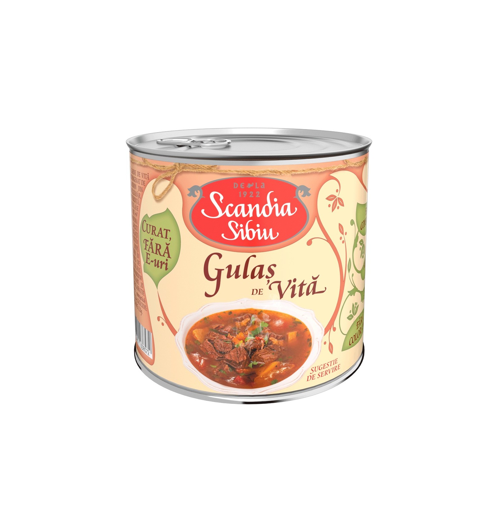 Ingredientes: carne de vaca 50%, agua, harina de trigo, aceite de girasol no hidrogenado, pasta de tomate, cebolla, almidón de maíz, sal yodada, extracto de carne de vaca, pimentón, azúcar, vinagre, especias, ajo.