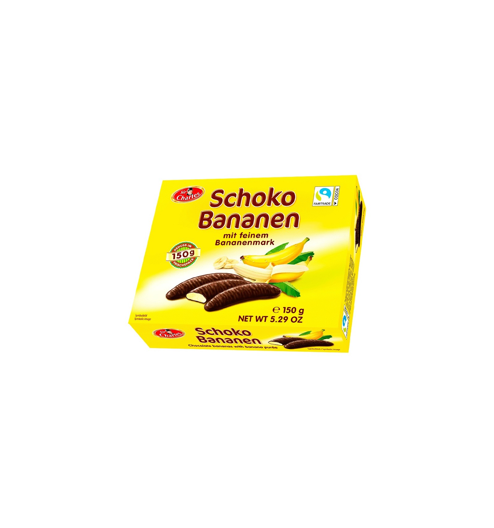 Ingredientes: merengues con sabor a plátano recubiertos con chocolate 25%. Azúcar, sirop de glucosa, agua, masa de cacao, pulpa de plátano 6%, manteca de cacao, agente humectante E420, agente gelificante E406, gelatina, acidulante E330, emulsionante E322 (soja), aroma natural, colorante E100. Puede contener trazas de frutos secos, gluten y leche.