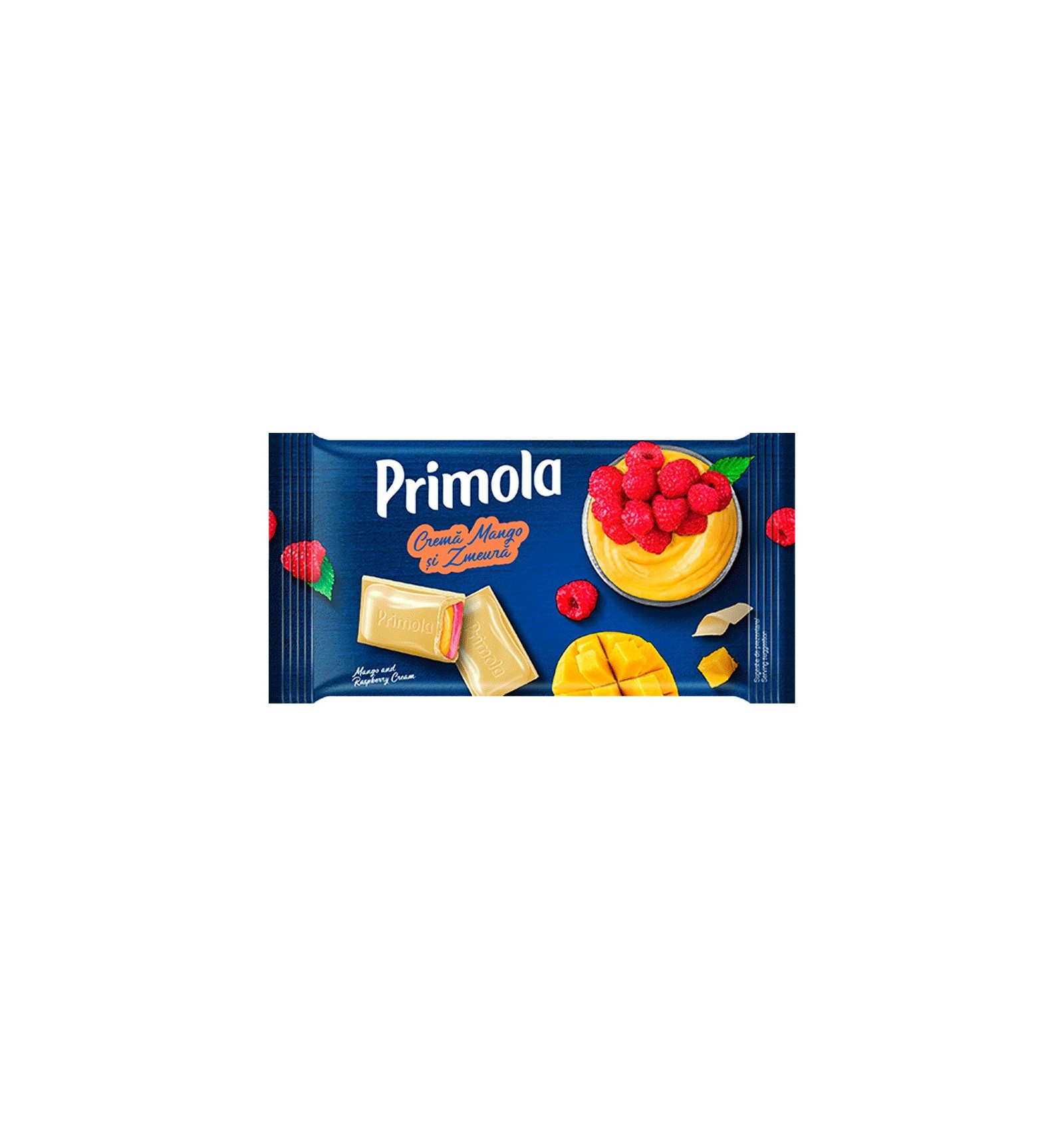 Ingredientes: azúcar, grasas vegetales (aceite de palma, aceite de karité), manteca de cacao, leche en polvo entera, leche en polvo desnatada, polvo de suero (de leche), grasa de leche, aceite de girasol refinado, polvo de mango 0,1% (jarabe de glucosa, concentrado de puré de mango), polvo de frambuesa 0,1% (concentrado de puré de frambuesa, maltodextrina), ácidos (ácido láctico, ácido cítrico), grasas vegetales (aceite de colza), emulsionantes (lecitina de soja, poliglicerol poliricinoleato), colorantes (curcumina, carmín), aromas. El chocolate blanco contiene: sólidos de cacao 29% como mínimo, sólidos de leche 20% como mínimo. Puede contener trazas de frutos secos, nueces, gluten, huevos.