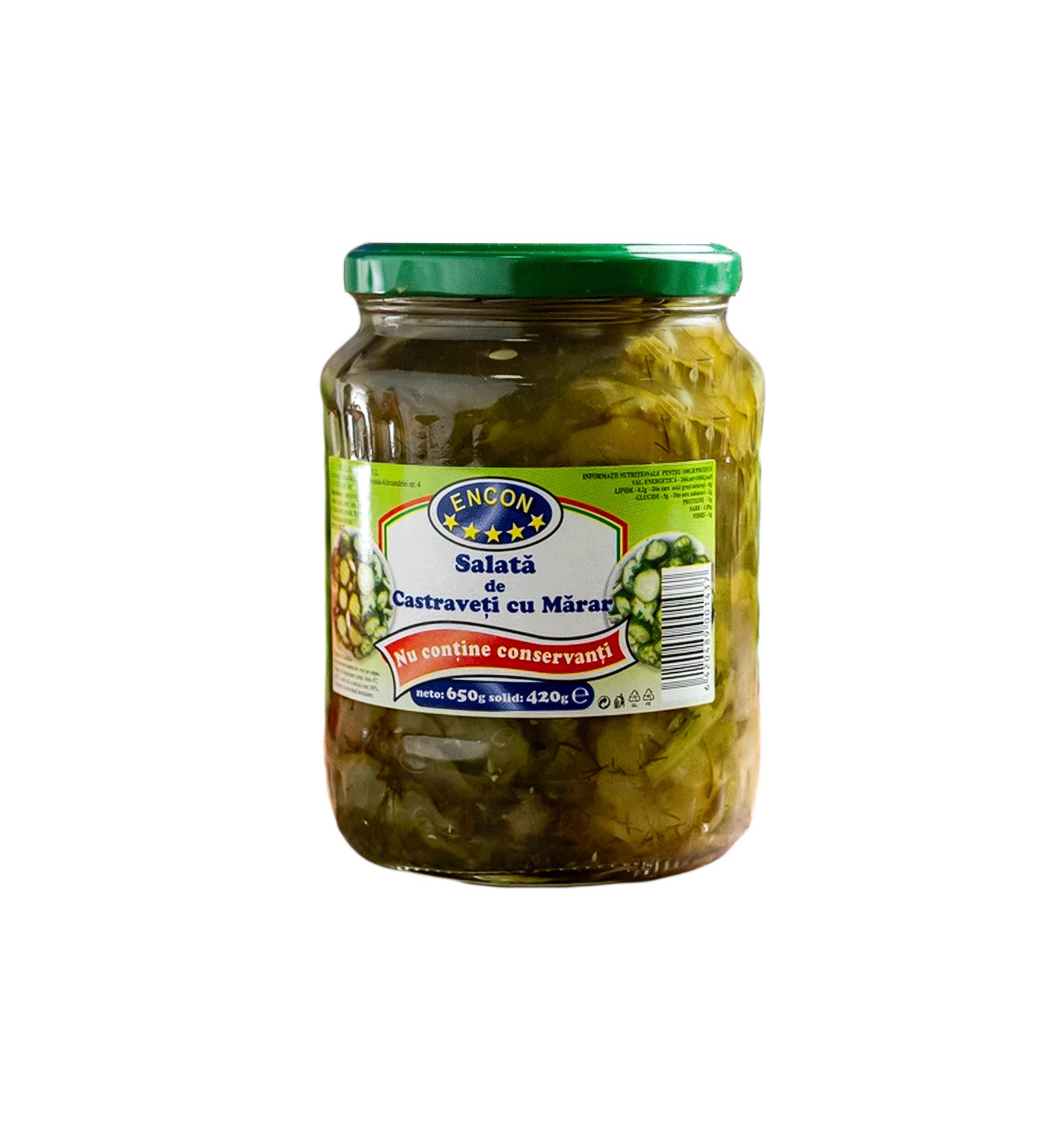 Ingredientes: pepino, eneldo, ajo, agua, vinagre, sal, azúcar.