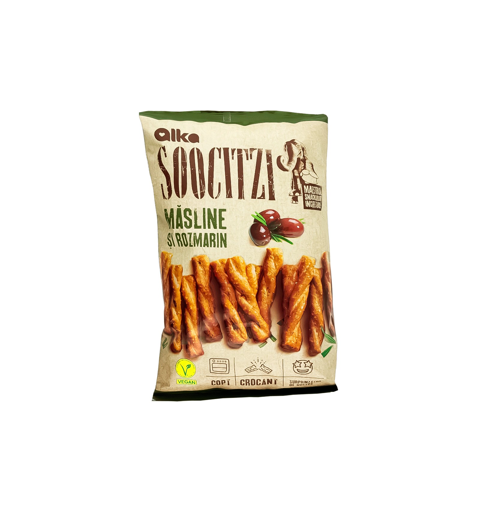 Ingredientes: harina blanca de trigo, aceitunas Kalamata 11.4% (aceitunas Kalamata 94%, sal, aceite de oliva virgen extra, acidificante: ácido láctico), hierbas y especias aromáticas (condimentos), grasa vegetal (palma), azúcar, extracto de cebada, extracto de levadura seca, romero 0.06&, aromas, levadura de panadería, sal marina. Puede contener trazas de: soja, sésamo y mostaza.