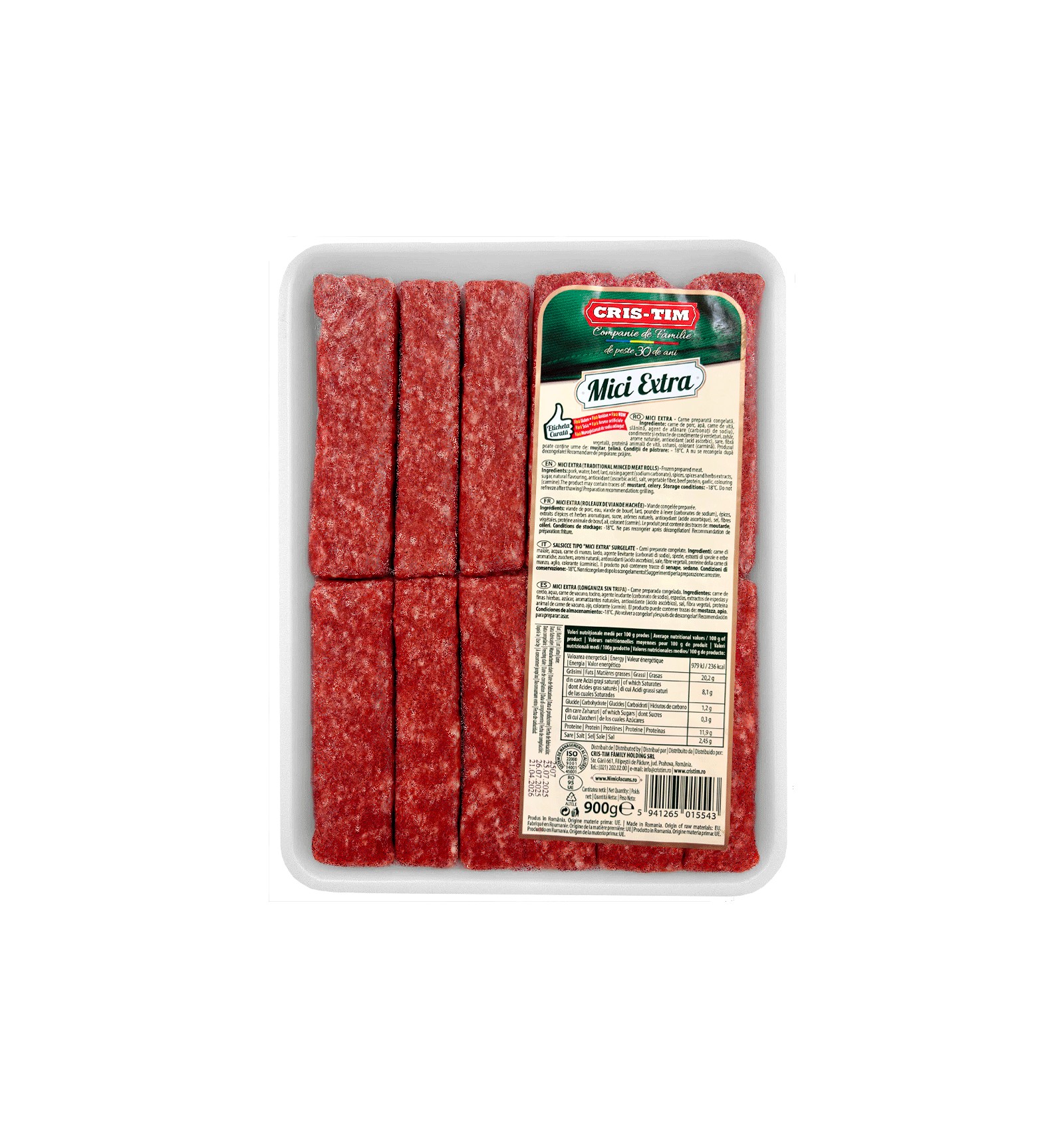 Ingredientes: Carne de cerdo, agua, carne de vacuno, agente de fermentación (carbonatos de sodio), especias y extractos de especias, azúcar, aromas naturales, antioxidante (ácido ascórbico), fibra vegetal, sal, proteína animal, apio, ajo, colorante (carmín). El producto puede contener trazas de mostaza.