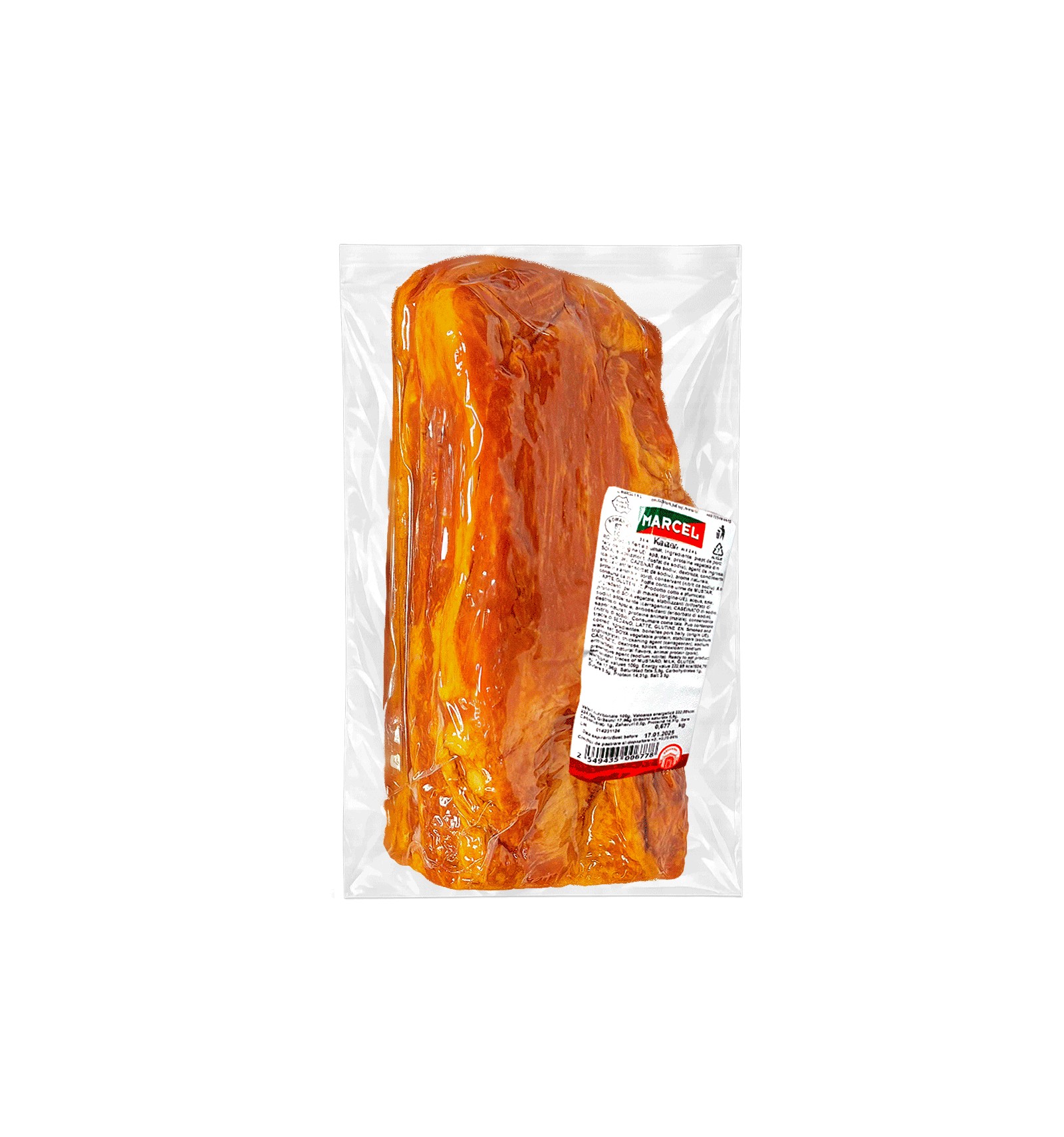 Ingredientes: pechuga de cerdo sin hueso (origen UE), agua, sal, proteína vegetal de SOJA, estabilizador (trifosfato de sodio), espesante (carragenina), CASEINATO de sodio, dextrosa, especias, antioxidante (eritorbato de sodio), aromas naturales, proteína animal (cerdo), conservante (nitrito de sodio). Puede contener trazas de mostaza, leche, gluten.
