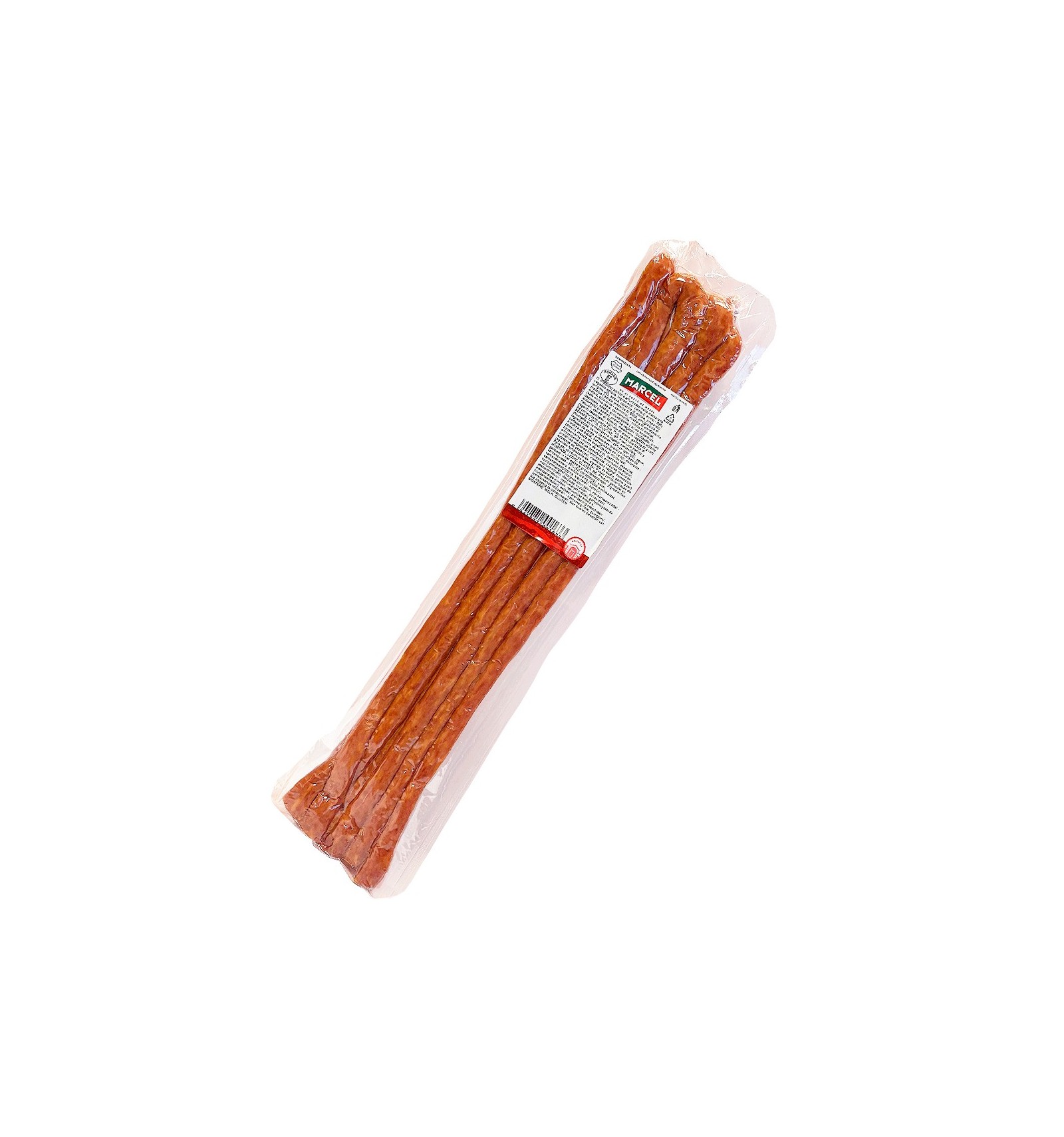 Ingredientes: carne de cerdo - 80% (origen UE), agua, tocino, preparado proteico (aislado proteico de SOJA, hemoglobina de cerdo, colorante - carmín), mezcla de condimentos (sal nitrificada (sal, conservante - nitrito de sodio), dextrosa, especias, antioxidantes (ácido ascórbico, eritorbato de sodio), proteínas vegetales hidrolizadas, aromas naturales, extractos de especias), membrana vegetal comestible (agentes de endurecimiento alginato de sodio, goma guar). Puede contener trazas de mostaza, leche, gluten.