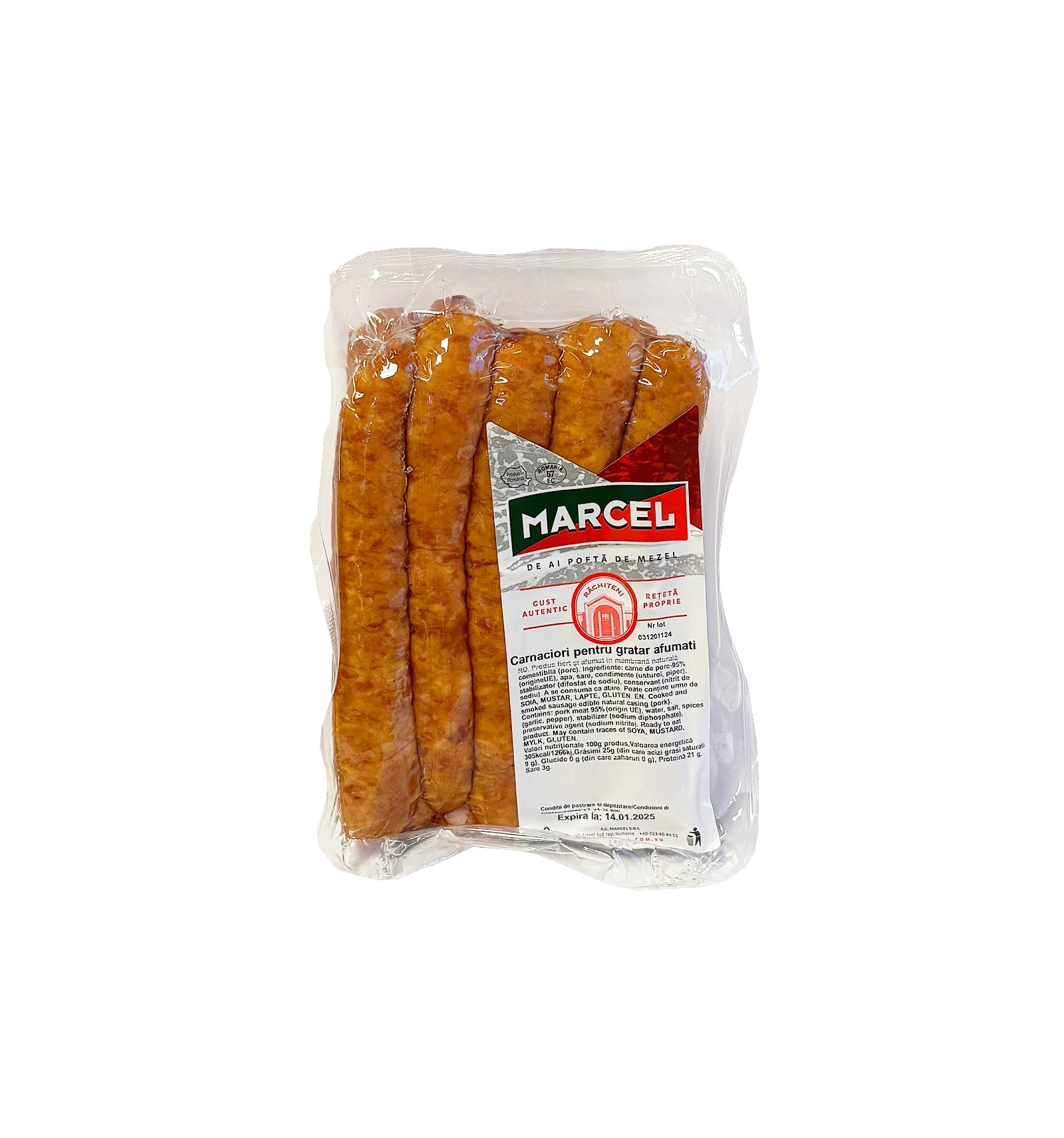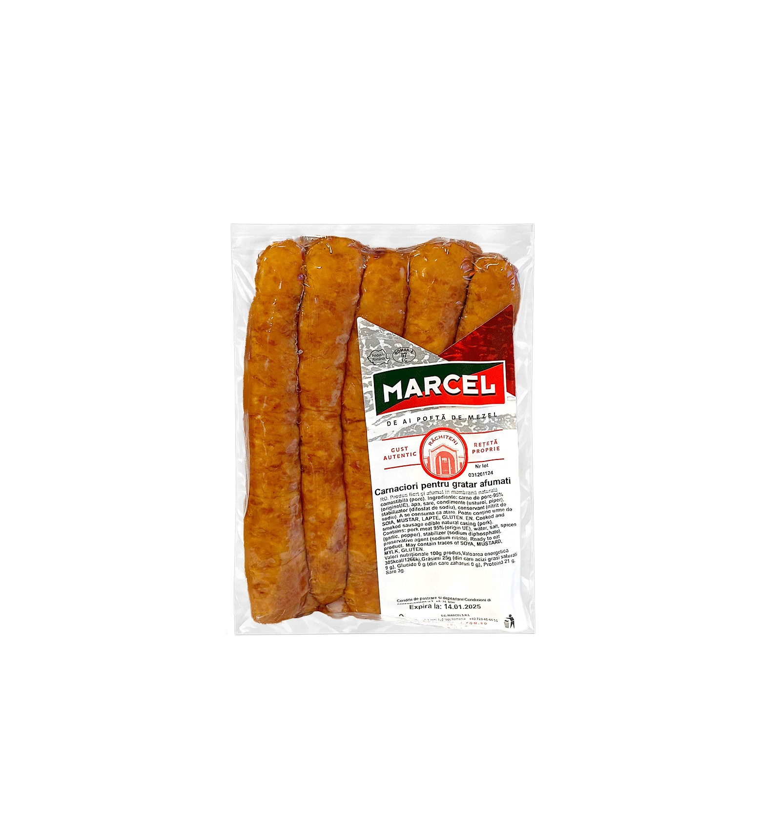 Ingredientes: carne de cerdo-95% (origen UE), agua, sal, condimentos (ajo, pimienta), estabilizador (difosfato de sodio), conservante (nitrito de sodio). Puede contener trazas de soja, mostaza, leche, gluten.