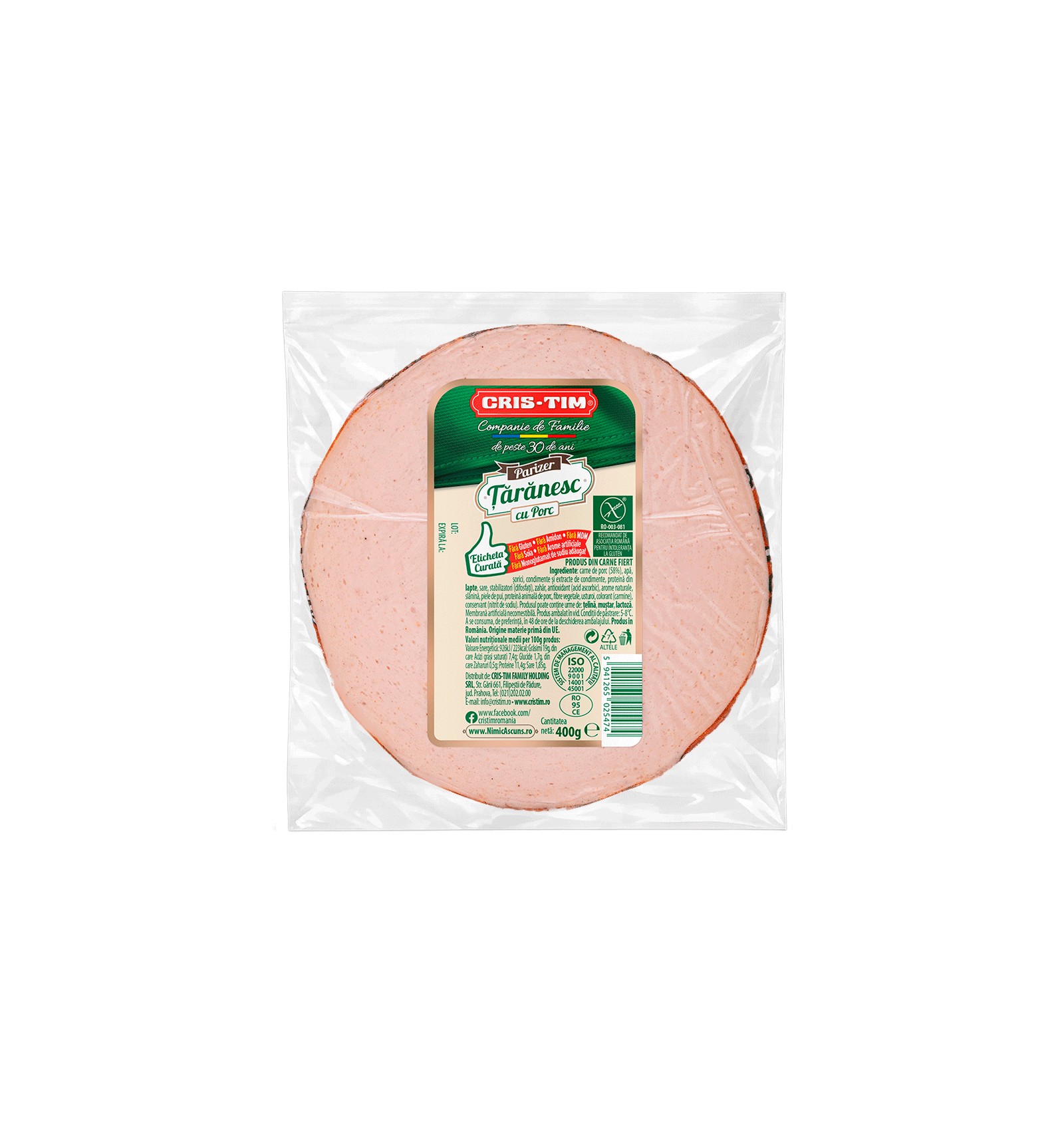 Ingredientes: carne de cerdo (58%), agua, corteza, especias y extractos de especias, proteína de leche, sal, estabilizantes (difosfatos), azúcar, antioxidante (ácido ascórbico), aromas naturales, tocino, piel de pollo, proteína animal de cerdo, fibras vegetales, ajo, colorante (carmin), conservante (nitrito de sodio). El producto puede contener trazas de: apio, mostaza, lactosa.