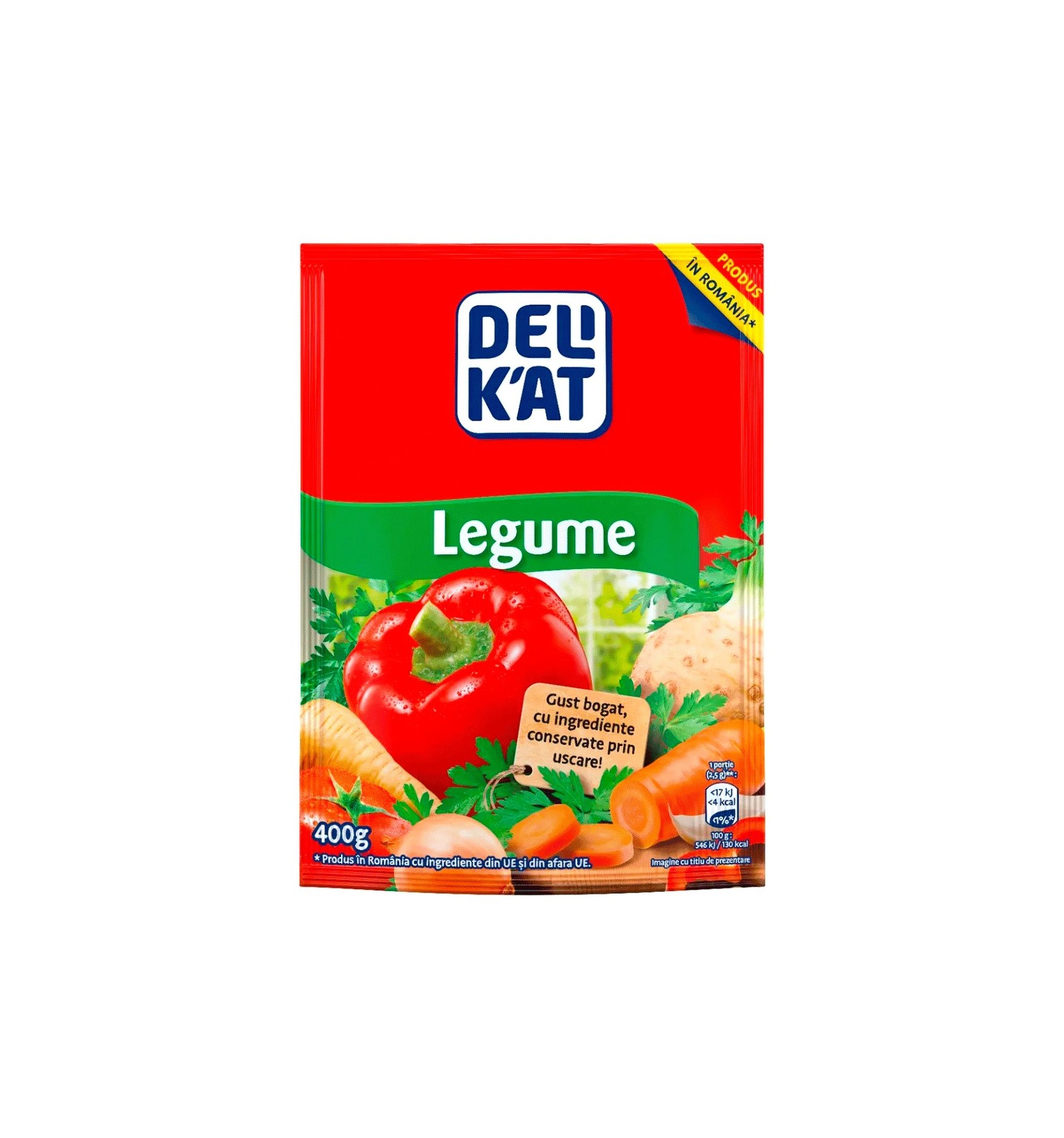 Ingrediente: sare iodată, zahăr, potențiatori de aromă (monoglutamat de sodiu, inozinat de sodiu, guanilat de sodiu), morcov (6,1%), păstârnac (1,9%), pătrunjel (0,7%), condimente (usturoi (0,3%), semințe de ȚELINĂ (0,2%), curcumă, rădăcină de pătrunjel), ardei gras roșu (0,5%), grăsime vegetală de palmier, ceapă (0,4%), sare, arome, praz (0,1%), roșii pudră (0,05%), colorant (riboflavină), extract de drojdie. Poate conține cereale care conțin GLUTEN, OU, LAPTE, MUȘTAR, SOIA.