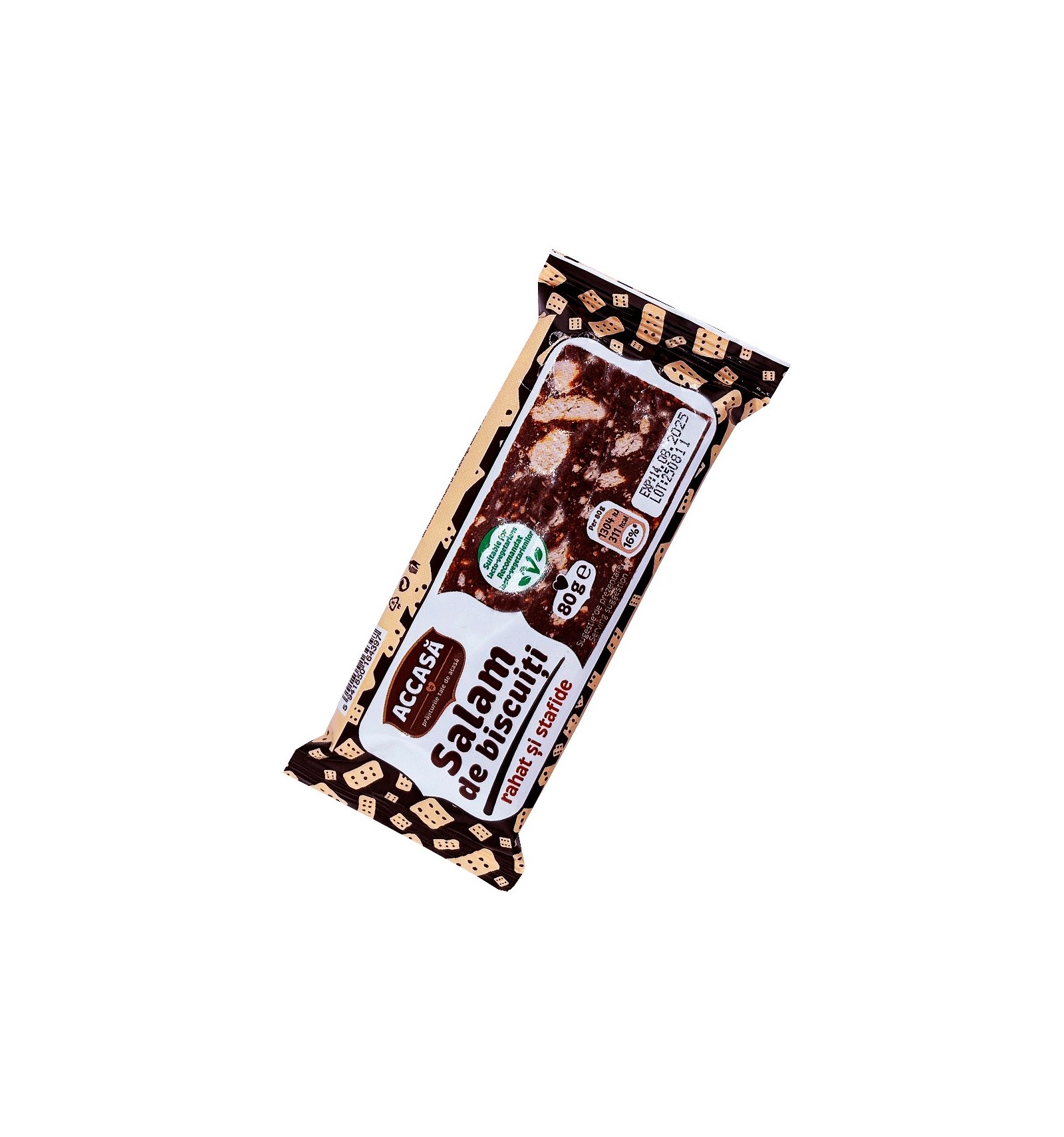 Ingrediente: biscuiti 40%, făină de GRÂU, zahăr, grăsimi vegetale (floarea-soarelui, rapiţă), sirop de glucoză-fructoză, amidon de porumb, emulsifiant: mono- și digliceride ale acizilor graşi, rahat 10%, stafide 2%, cacao pudră 2%, agenți de afanare: bicarbonat de sodiu, bicarbonat de amoniu; conservant: sorbat de potasiu; aromă de rom. Poate conține urme de: LAPTE, OU, SOIA, ARAHIDE.
