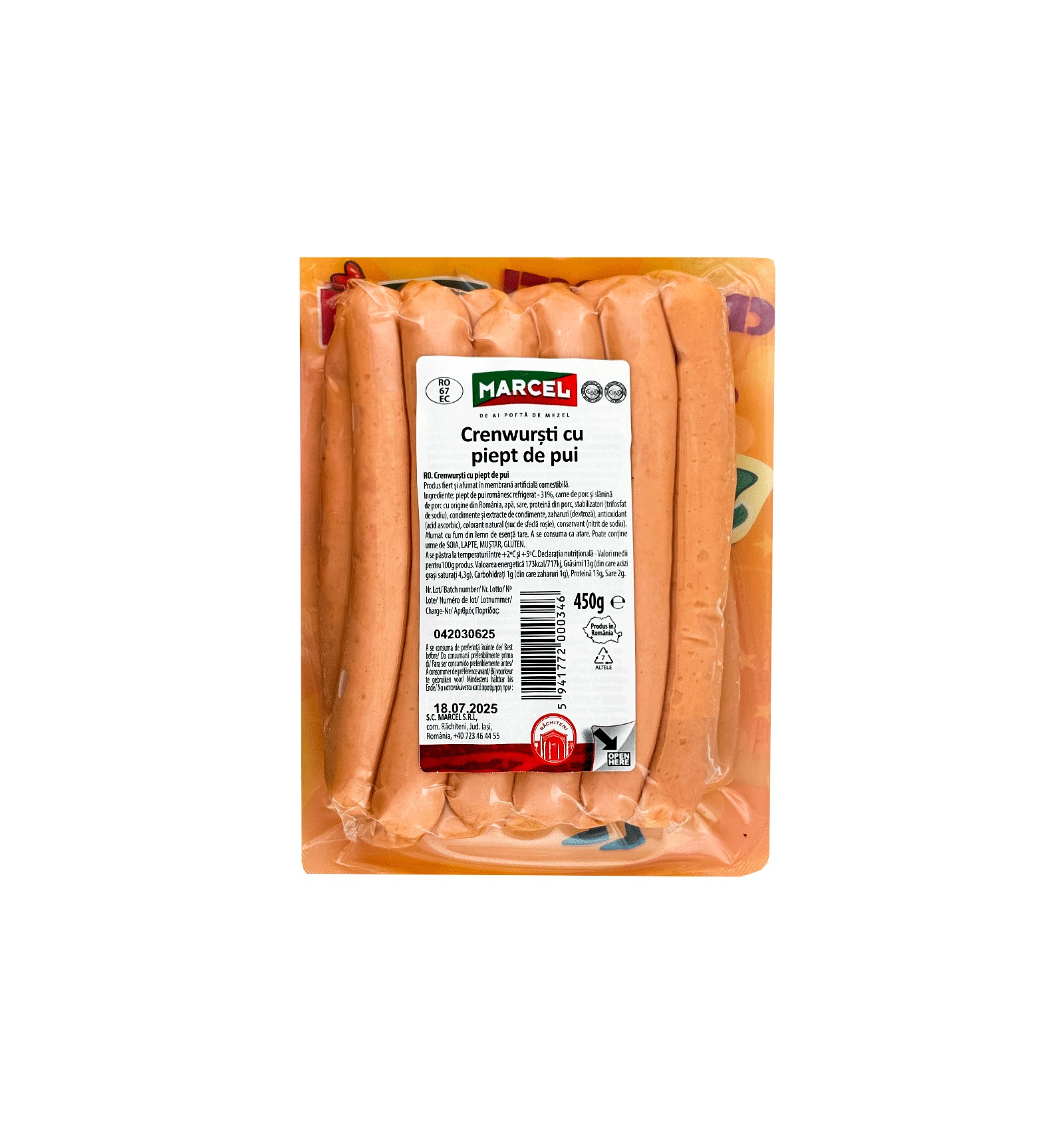 Ingrediente: piept de pui - 32% (origine UE), slănină (origine UE), apă, şorici (origine UE), proteină vegetală din SOIA, mix de asezonare [sare nitrică (sare, conservant - nitrit de sodiu), stabilizatori (difosfat de sodiu, trifosfat de sodiu), condimente (boia dulce, piper, nucşoară, usturoi) şi extracte de condimente, zaharuri (dextroză), antioxidant (acid ascorbic), potenţiator de aromă (monoglutamat de sodiu), arome], colorant (carmin). A se consuma ca atare. Afumat cu fum natural din lemn de esenţă tare. Poate conţine urme de mustar, lapte, gluten.