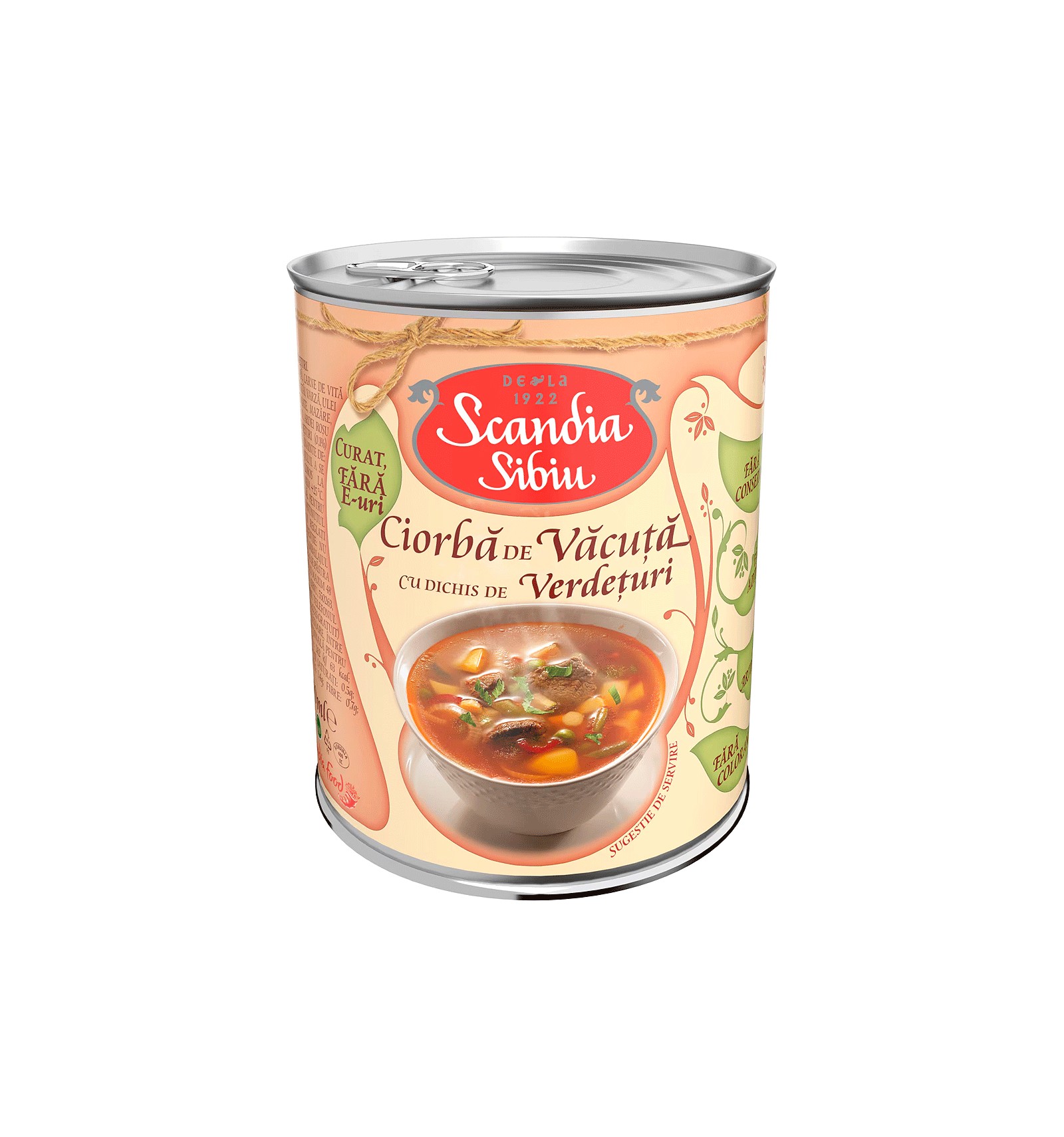 Ingrediente: apa, carne de vita (18%), cartofi, pasta de tomate, fasole verde pastai, varza, ulei vegetal nehidrogenat, mazare, sare iodata, ceapa, morcovi, ardei, acidifiant: sare de lamaie, frunze de patrunjel (0,06%), frunze de leustean (0,05%), condimente.