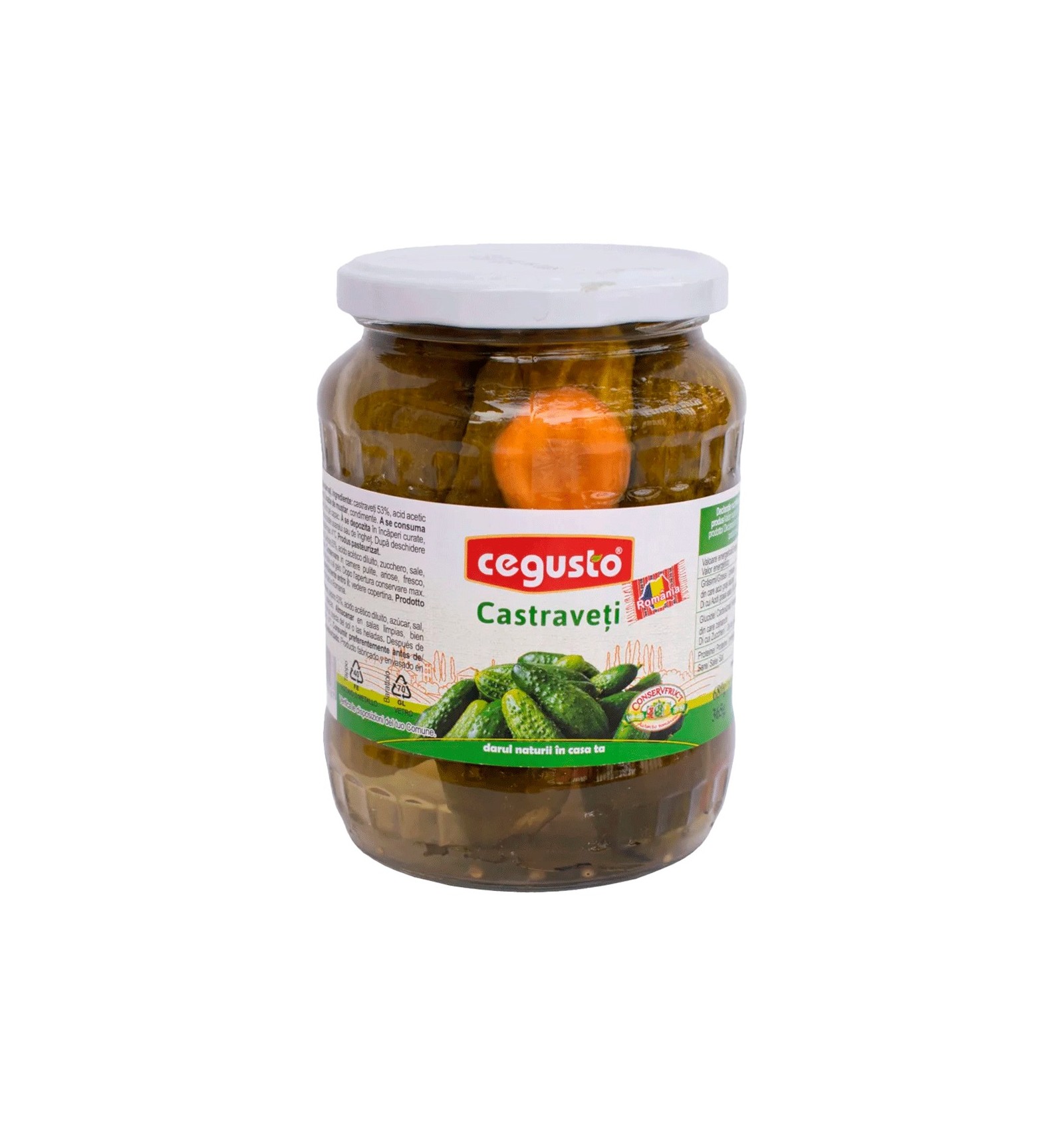 Ingrediente: castraveți 53%, acid acetic diluat, zahăr, sare neiodată, boabe de muștar, condimente.