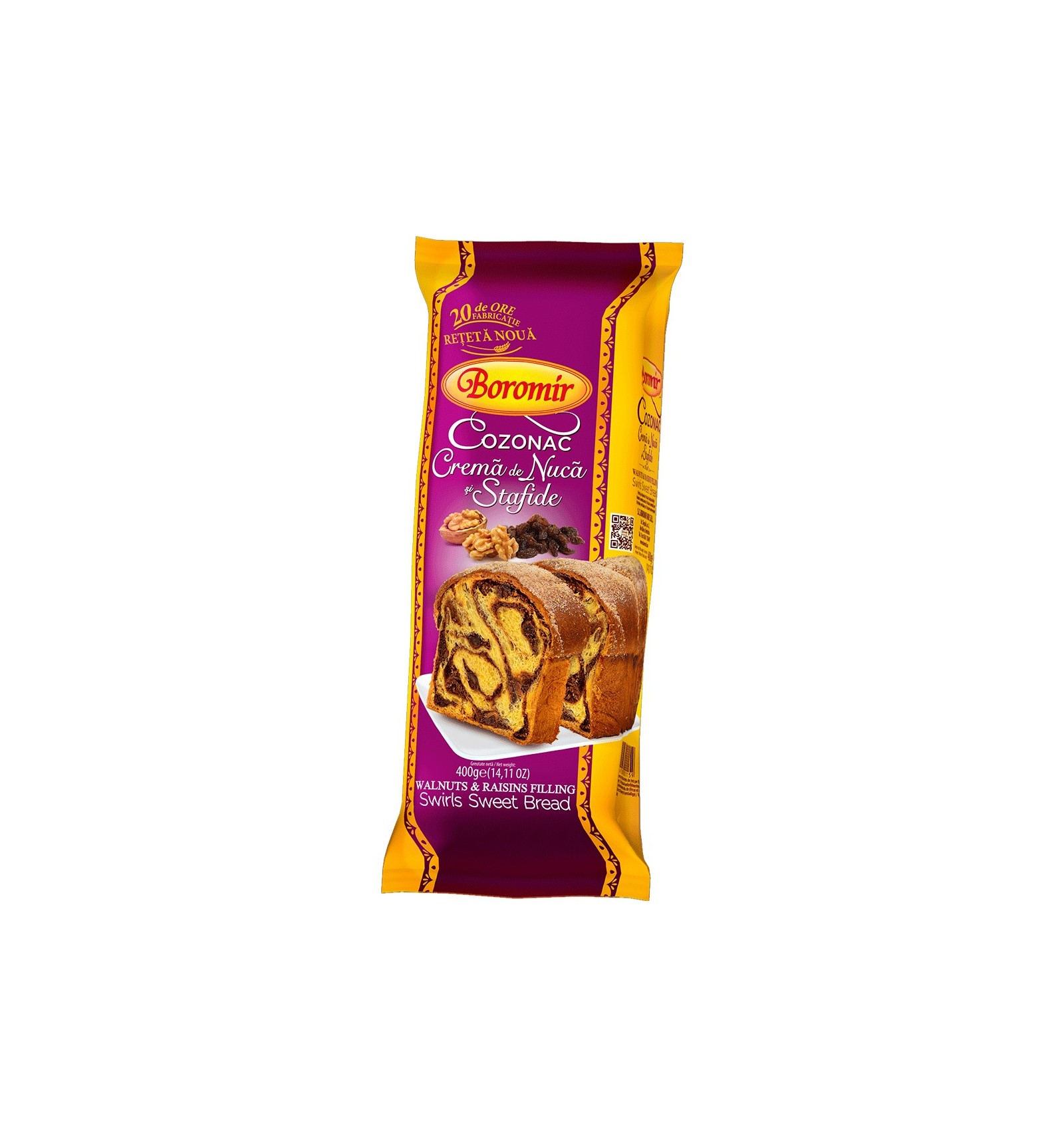 Ingrediente: făină albă de grâu, zahăr, stafide 8%, drojdie naturală (făină albă de grâu, apă), albuş de ou, nucă 5%, uleiuri vegetale (palmier, floarea soarelui, rapiţă), gălbenuș de ou, apă, unt, sirop de zahăr invertit, emulsifianți: mono și digliceride ale acizilor grași și lecitină de soia, lapte praf degresat, cacao pudră degresată, alcool etilic, drojdie, sare iodată, arome. Produsul poate conţine urme de nucă.