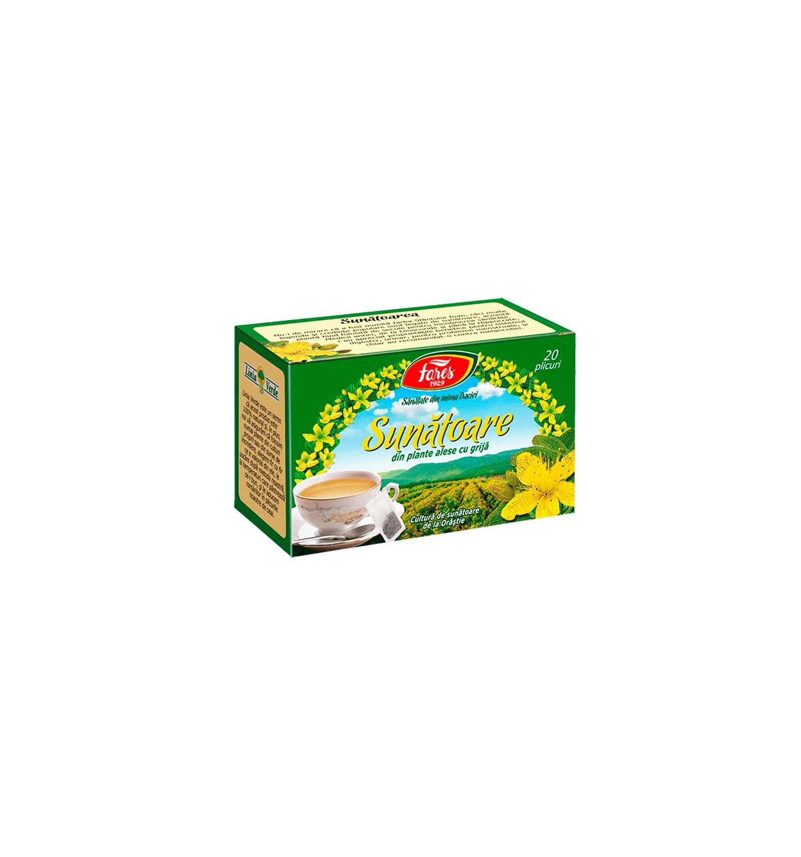 Ingrediente: Partea aeriană a plantei Hypericum perforatum L., fam. Hypericaceae, conţine hipericină, flavonozide, epicatecol, proantocianidoli, acizi fenol-carboxilici, carotenoide, vitamina C, hiperforină şi adhiperforină, xantone, colină, rezine, substanţe minerale.