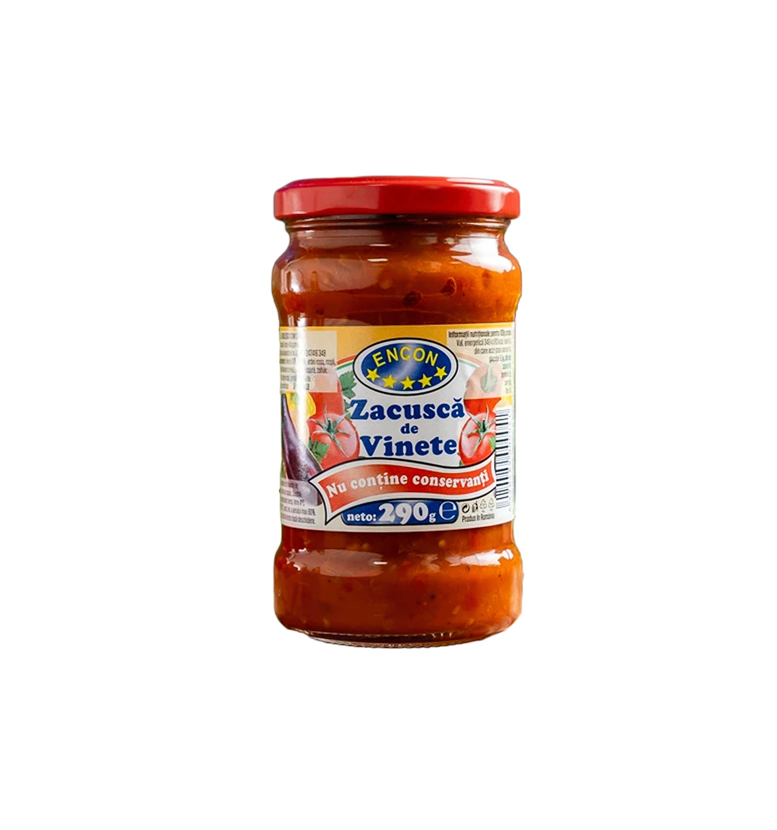 Ingrediente: vinete 60%, ceapă, ardei roșu, roșii, ulei de floarea soarelui, sare neiodată, zahăr, piper.