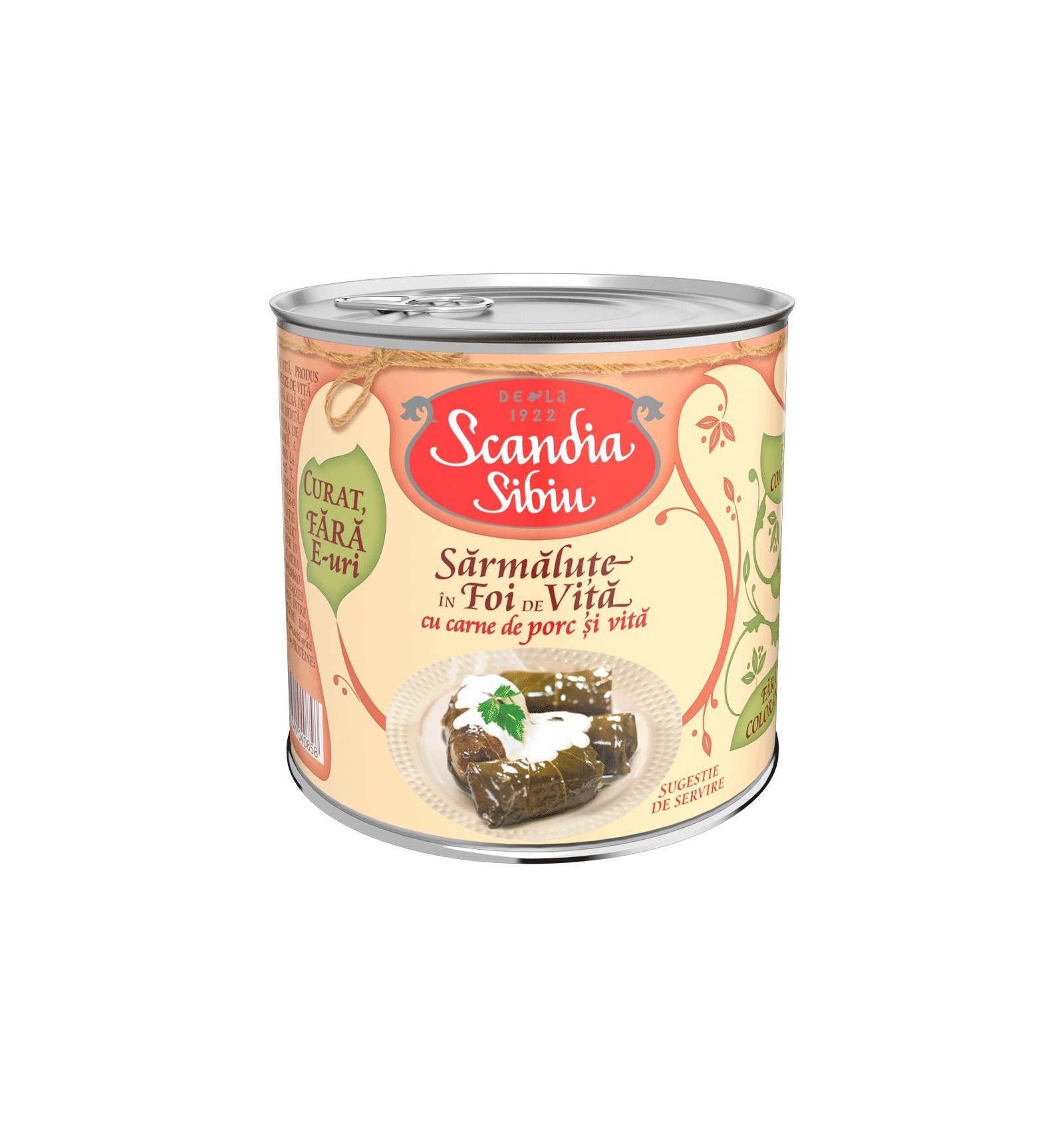 Ingrediente: Apă, carne de porc 22%, frunze de viță de vie 16%, carne de vită 5%, pastă de tomate, făină albă de grâu, orez, ulei vegetal de floarea-soarelui, sare iodată, ceapă, piper, mărar, cimbru, foi de dafin.