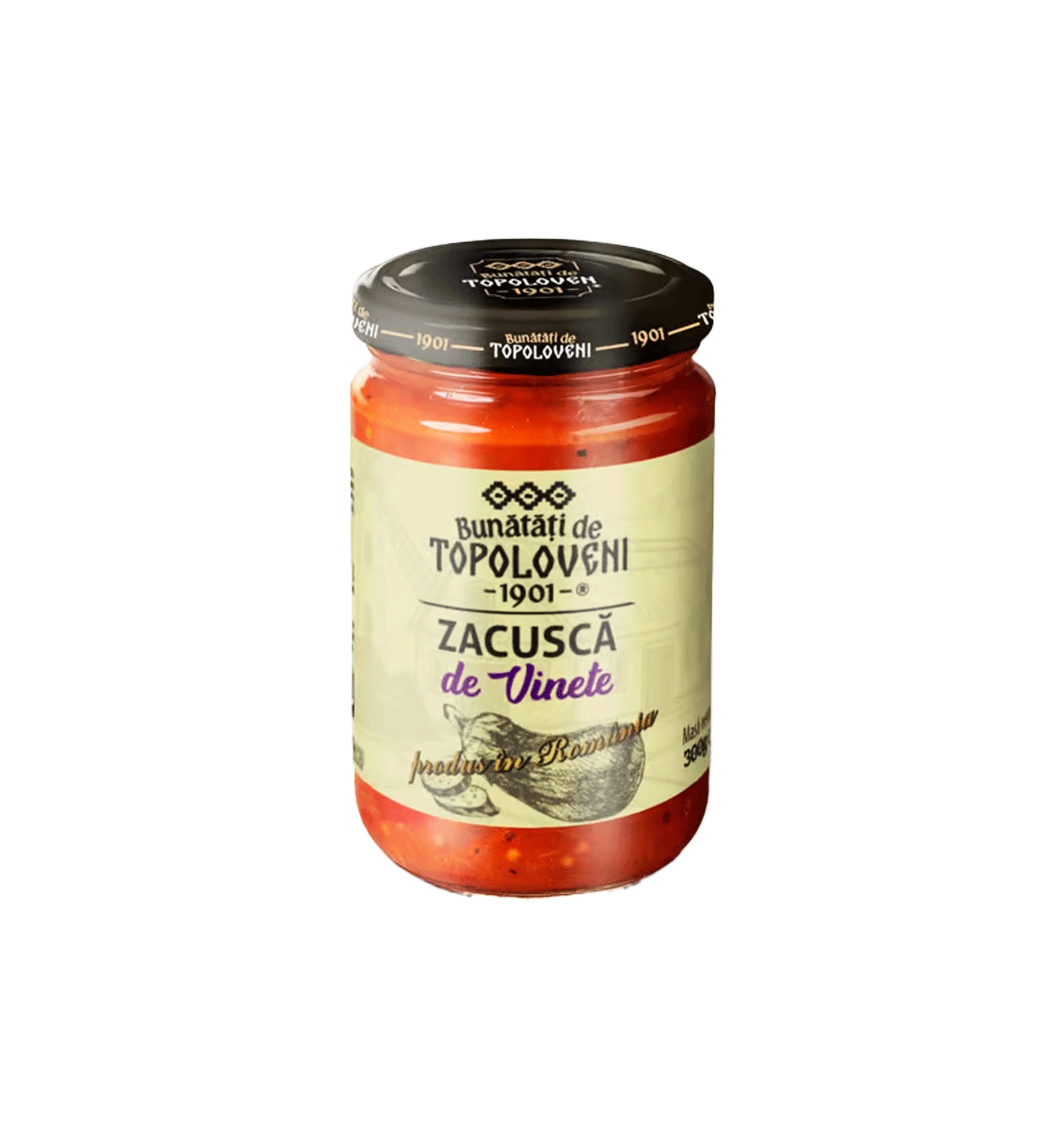 Ingrediente: vinete coapte (minim 50%), roşii, ardei copt (min. 12%), ceapă, morcovi, ulei de floarea soarelui, pastă de tomate, sare iodată, condimente.
