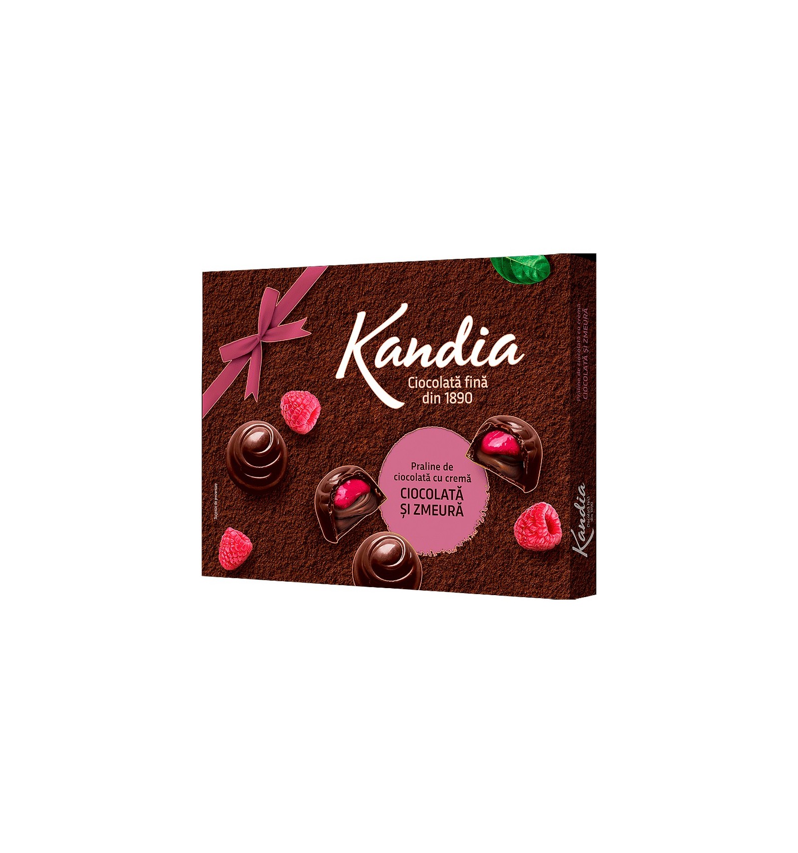 Ingrediente: zahăr, umplutură de zmeură 18% [zahăr, sirop de glucoză, umectanți (sorbitol, glicerină), apă, piure de zmeură 0,18%, agent de gelifiere (pectină), acid (acid citric), colorant (antociani), aromă], masă de cacao, grăsimi vegetale (ulei de palmier, ulei de shea), unt de cacao, lapte praf degresat, pudră de cacao cu conținut redus de grăsimi, derivat de pudră de zer (din lapte), ciocolată 0,9% [zahăr, masă de cacao, unt de cacao, grăsimi vegetale (ulei de palmier, ulei de shea), emulgatori (lecitină de soia, poliglicerol poliricinoleat), aromă], grăsime din lapte, emulgatori (lecitină de soia, poliglicerol poliricinoleat), arome. Ciocolata conține grăsimi vegetale pe lângă untul de cacao. Ciocolata conține: solide de cacao 40% minim. Poate conține urme de arahide, nuci, nucă de cocos, gluten, ouă.