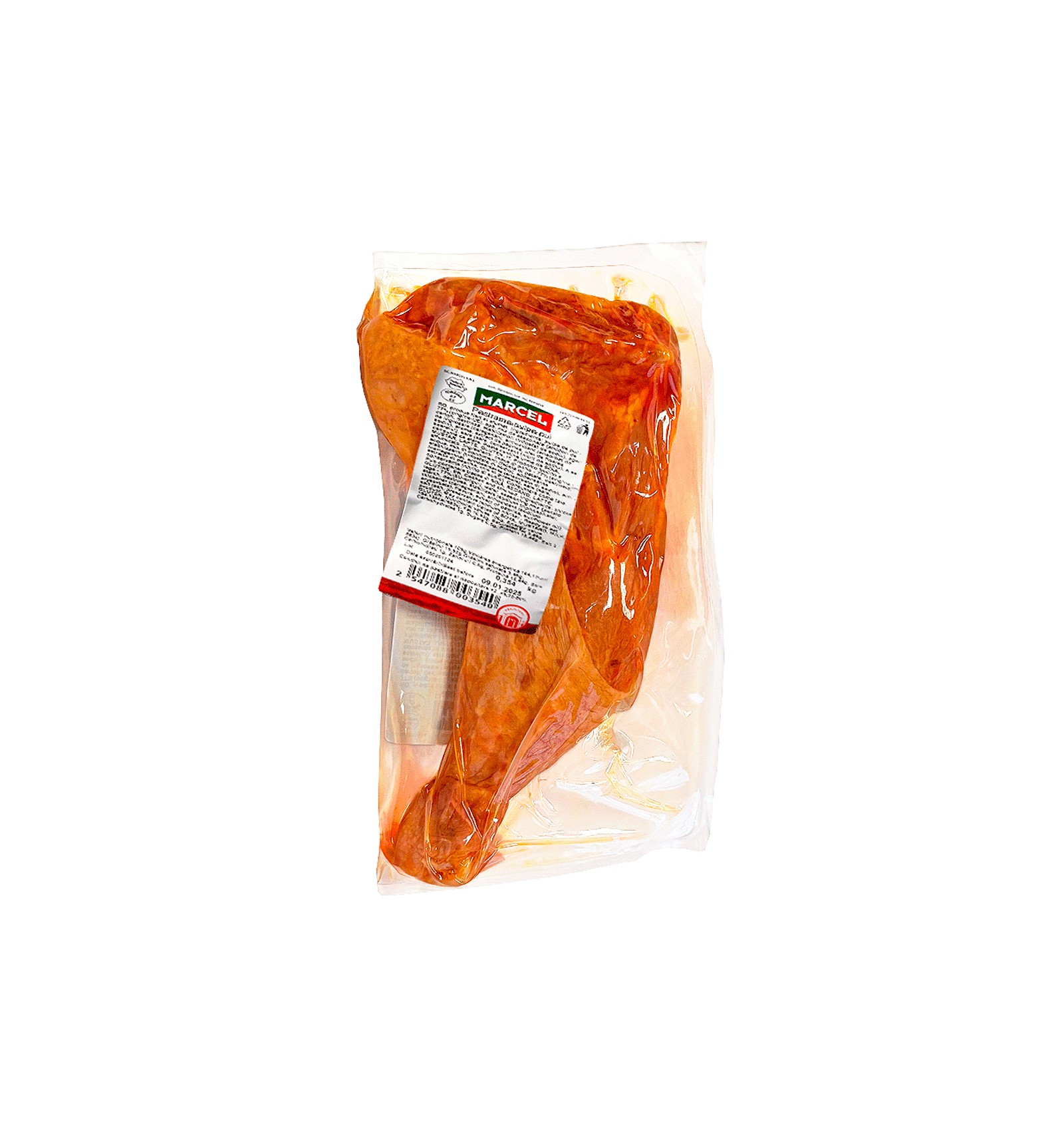 Ingrediente: pulpe de pui - 77% (origine-UE), apă, mix de asezonare (amidon de cartofi, dextroza, stabilizatori (trifosfat de sodiu), agent de ingrosare (caragenan), antioxidant (erisorbat de sodiu), arome, extract de paprika, ulei de floarea soarelui), sare (sare, conservant (nitrit de sodiu). Poate contine urme de SOIA, MUSTAR, LAPTE, GLUTEN.