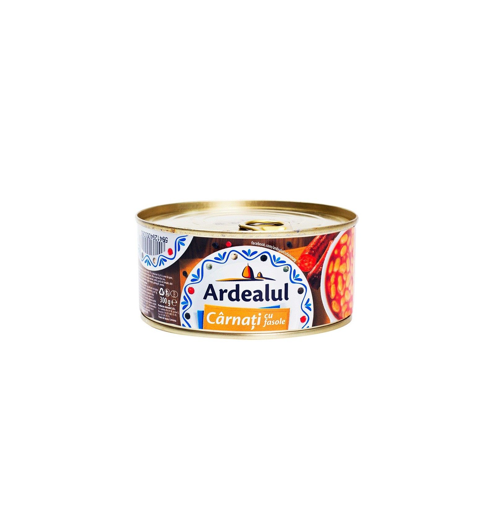 Ingrediente: apa, fasole boabe 33%, carnati 16,6% (carne de porc, proteina vegetala din soia, proteina animala din porc, fibra vegetala din soia, condimente), legume in proportii variabile (ceapa, morcovi, ardei), pasta de tomate, ulei vegetal de floarea soarelui, sare, condimente (piper negru, patrunjel), aroma.