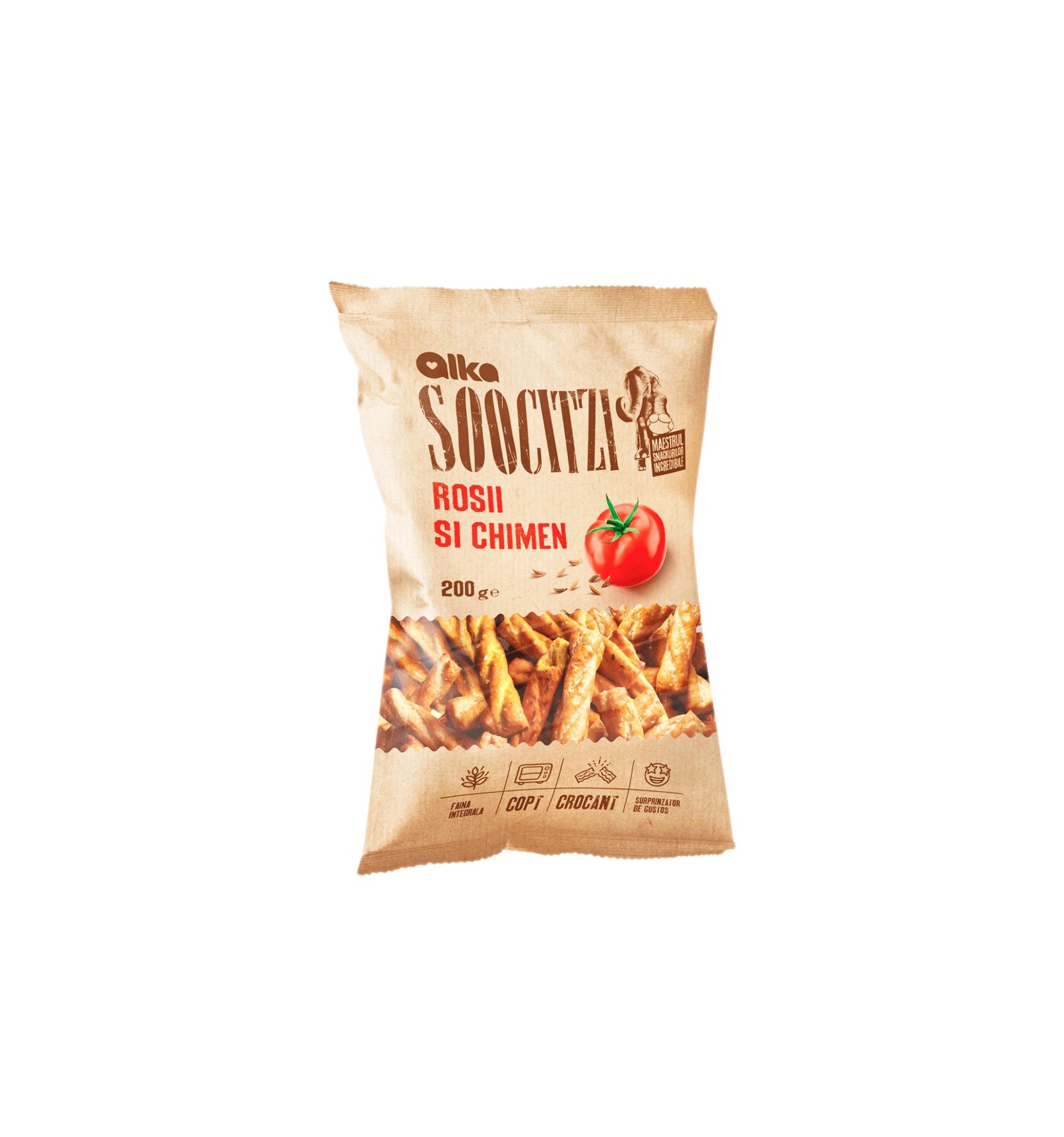 Ingrediente: Făină albă din grâu, grăsime vegetală (palmier), zahăr, extract de malț din orz, pudră de roșii 3.8%, făină integrală din grâu, zahăr brun, maia din grâu, chimen 1%, oregano, busuioc, rozmarin, sare de mare, drojdie, extract de drojdie. Alergeni: cereale care conțin gluten și produse derivate. Poate contine urme de soia, susan si mustar.